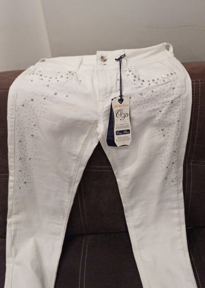 Üzerinde pırıltılı taşları olan, esnek, ince kot kumaşından pantolon. Siyah askılı t-shirt hediyesi.