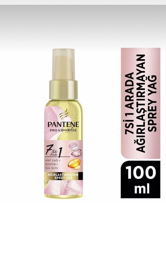Pantene Pro-V 7'si 1 Arada sprey yağ, nane yağı, biotin ve çiçek suyu içerir. Saçı ağırlaştırmadan bakım sağlar. 100 ml şişede.