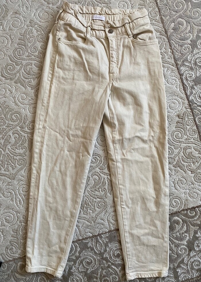 Krem rengi mom jean pantolon Bedeni ve markası görsellerde mevcut Çok beğenerek aldım ama fiziğime yakıştırmadığım için hiç giyemedim Kumaşı oldukça kaliteli ve rengi çok güzel Alırken fark etmemişim çok minik belli olmayan bir defosu varmış ancak yine de belirtmek istedim görsele ekledim