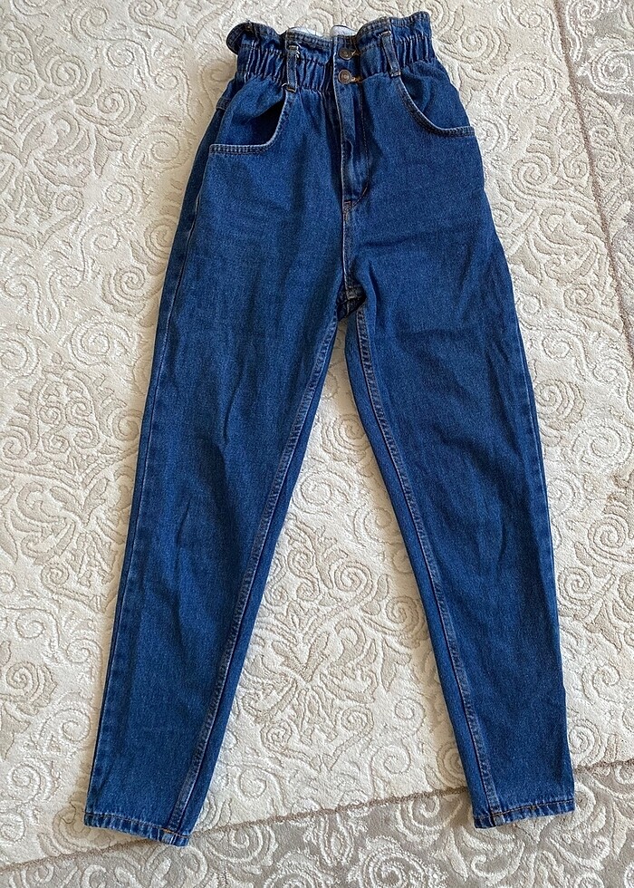 Koyu mavi mom jean 25 beden Bana küçük geldiği için satıyorum Kalıbı ve kumaşı oldukça güzel Beli büzgülü lastikli