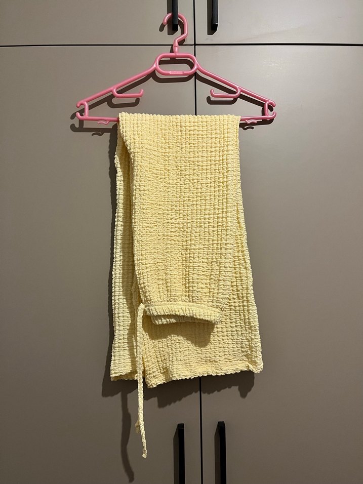 Pastel renginde sarı. Hiç giymediğim için üstümde fotoğraf yok maalesef. Yazlık bi kumaşı var