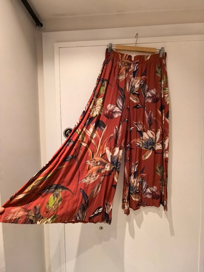 Bir kaç kez giydim. Çok rahat,dökümlü, hafif, pamuklu viskoz kumaş. Üstte etek gibi duruyor gerçekten. Beli lastikli.Zemin kiremit renktir.
