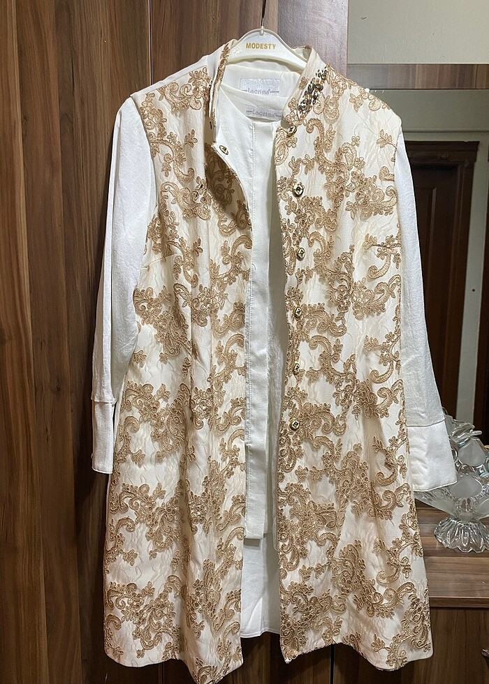 Gömlek , yelek ve pantolondan oluşan üçlü takımdır . Yaka kısmı taş işlemeli , gömlek düğmeleri uyumlu şıklıkta , yelek tül üzeri güpürdür. 46 bedendir . Temiz ve kusursuzdur .