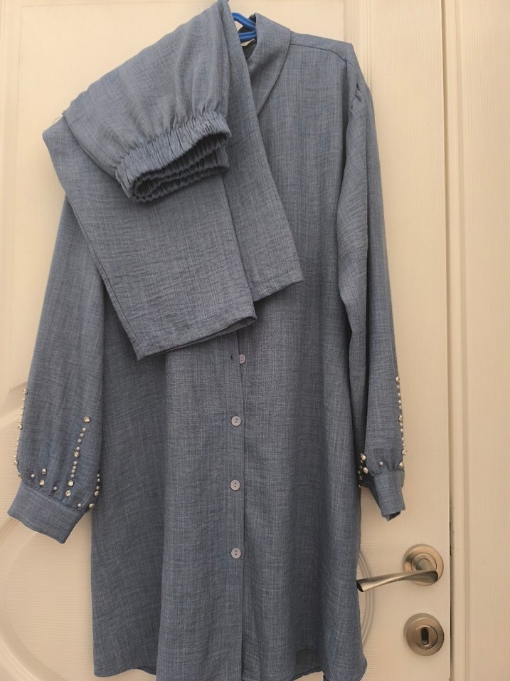 kot görünümlü rahat kumaş 2 beden 38 42 beden aralığına uyumlu pantolon boy 90 basen 51 tunik ön 82 arka 100 cm hiçbir deformesi yoktur tripen marka