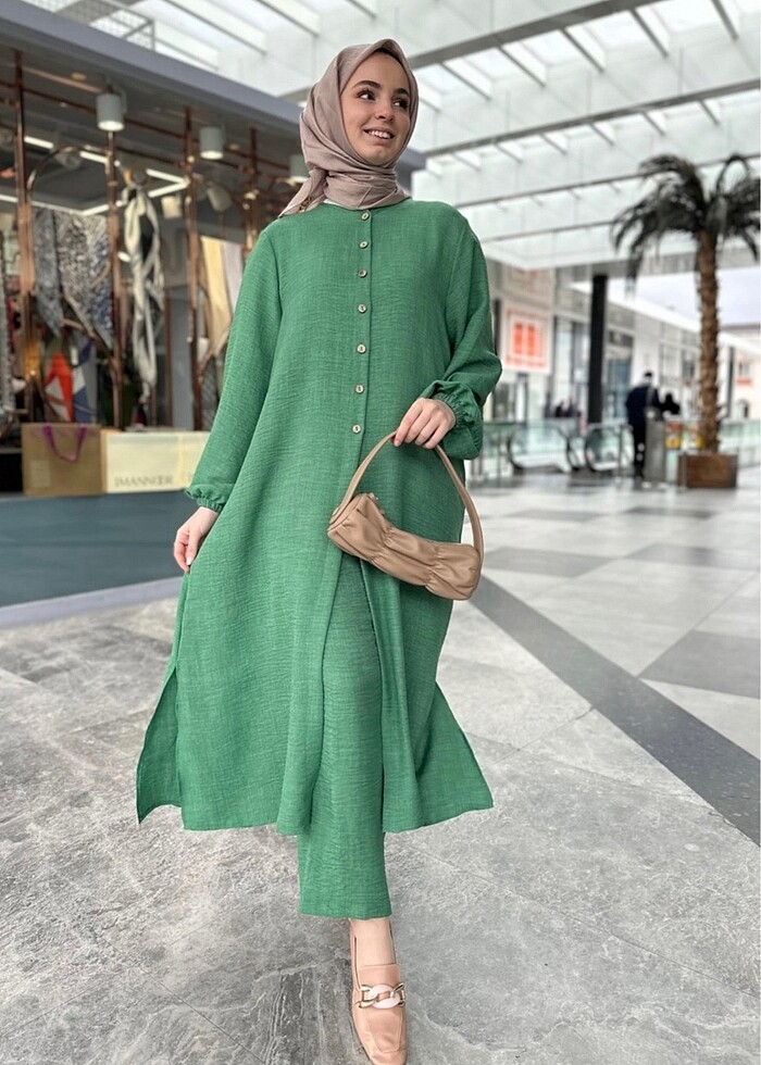 Çok fazla giyilmedi. Yepyeni. 2 beden. Bol giyinmek isteyen 38 bedenler için de uygun. Pantolonu ile birlikte takım. Aynısı boutiqeoz markasında 1100 tl. Sayfasına bakabilirsiniz. Bendekinin fotoğrafını çekmeye vaktim olmadı ama özelden sorarsanız ölçülerini de fotoğrafını da gönderebilirim