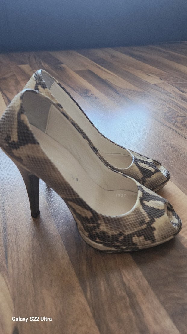 Bej yılan desenli deri stilettolar, tokalı detaylı, romantik akşamlar için uygun yüksek topuklu ayakkabı. 2 kez giyildi.
