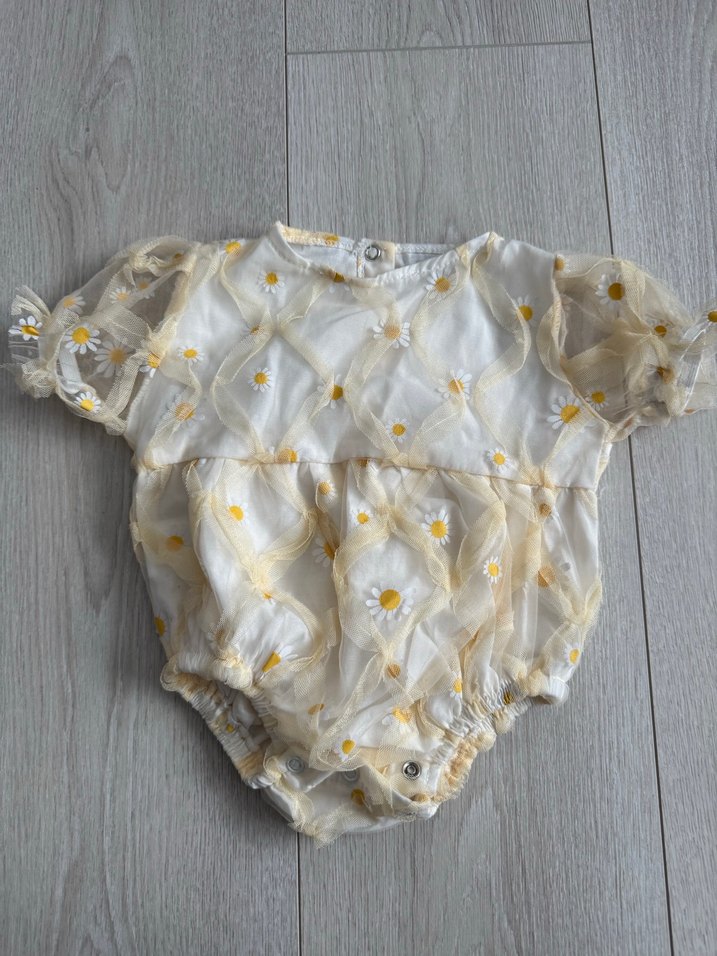 papatya desenli tüllü bebek kız tulumu. balon kol detaylı, bel ve bacaklarda lastikli rahat kesim. 3-6 ay beden
