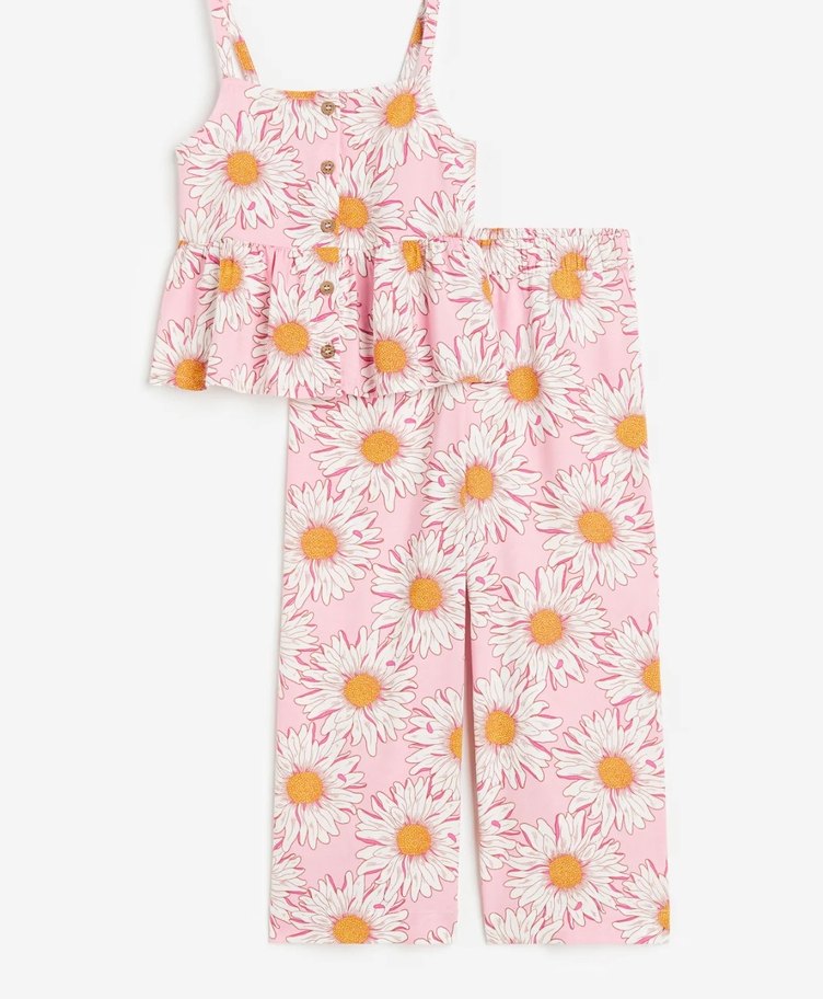 Papatya desenli, düğmeli, pastel pembe renkli askılı bebek kız takım. Üstü düğmeli ve uyumlu pantolon içerir. Çok tatlı hoş efil efil bir takım 2 kez giydi 1,5-2 yaş yazıyor ama benim kızım 3 yaşında da giydi hm nin kalıpları biraz büyük oluyor #hm #h&m #hmkizcocuktakim #h&mtakim