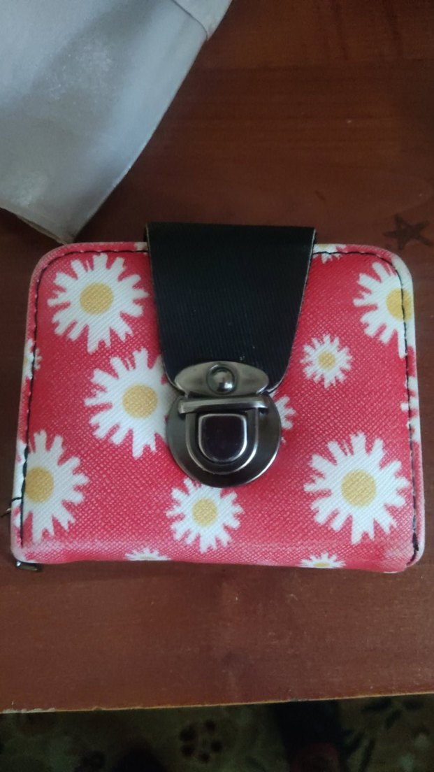 Renkli pembe kadın cüzdanı, papatya desenli ve tokalı kapamalı, sentetik kumaştan ve vintage tarzda.