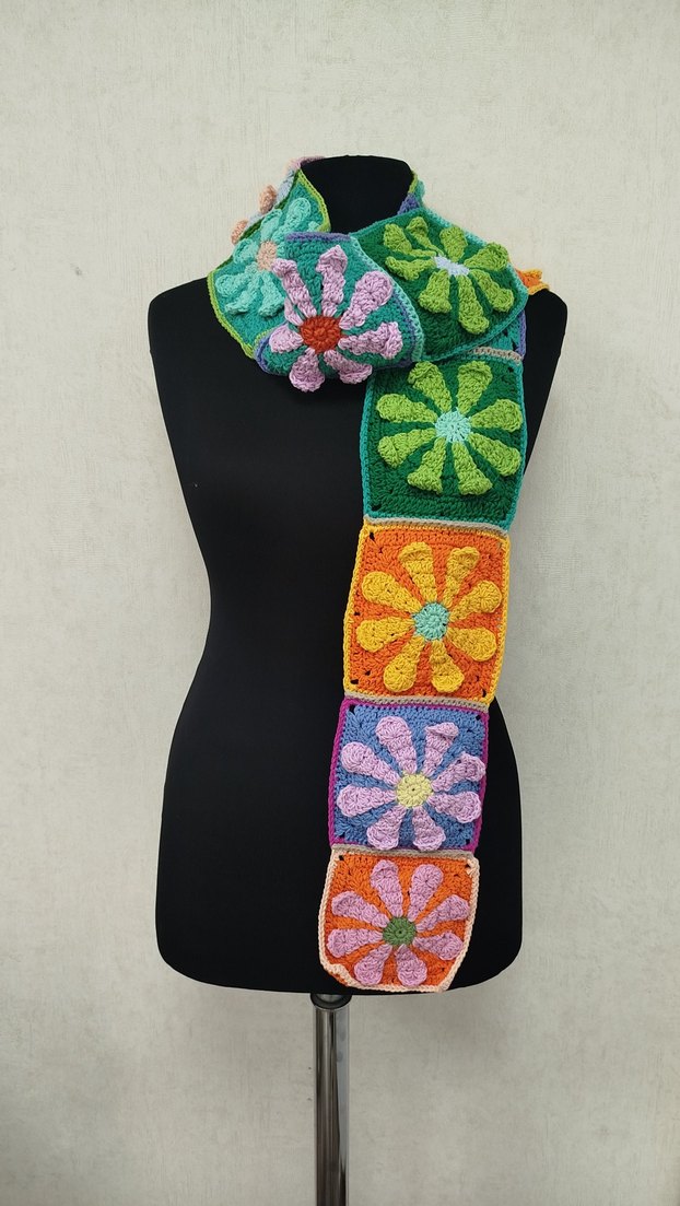 Canlı çiçek desenleriyle renkli örgü kadın şal, yumuşak örme kumaştan bohem tarzı sunar. Retro ve hippie dokunuşlar için uygundur.