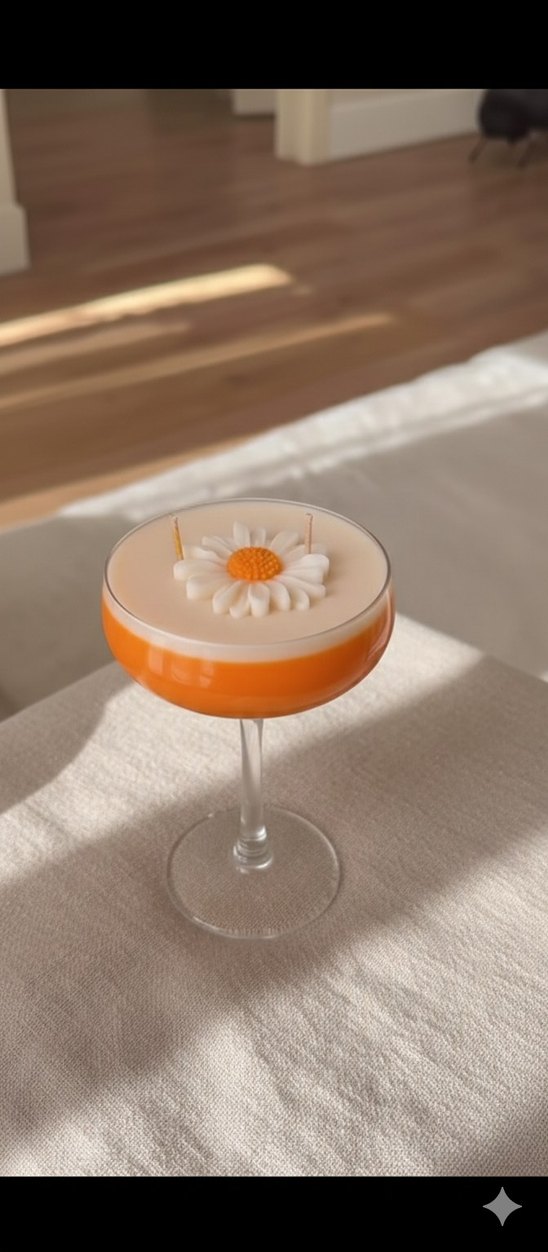 Pastel turuncu renkte, üzerinde papatya detayı bulunan ve şeffaf camda sunulan yumuşak dekoratif mum. ️