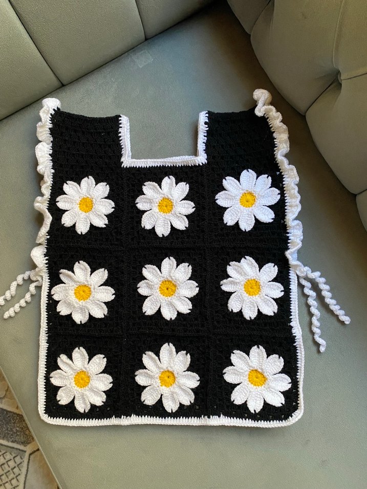 Siyah taban üzerine beyaz papatya çiçek desenleri ve yandan ipli bağlamalı model el örgüsü ve istenilen beden özel yapılır