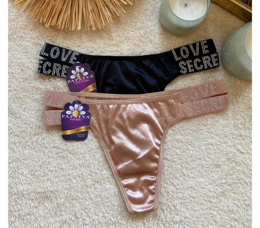 adet fiyatıdır.yumuşak ve parlak kumaştan yapılmış kadın tanga. Elastik bel bantlarında 'LOVE' ve 'SECR' yazıları bulunur.