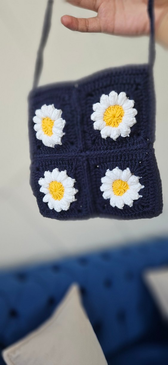 Renkli nakışlı papatyalarla süslenmiş mavi örgü kadın çantası, günlük kullanıma uygun bohem ve rahat bir stil sunar. Örgü kumaşı yumuşak ve konforludur.