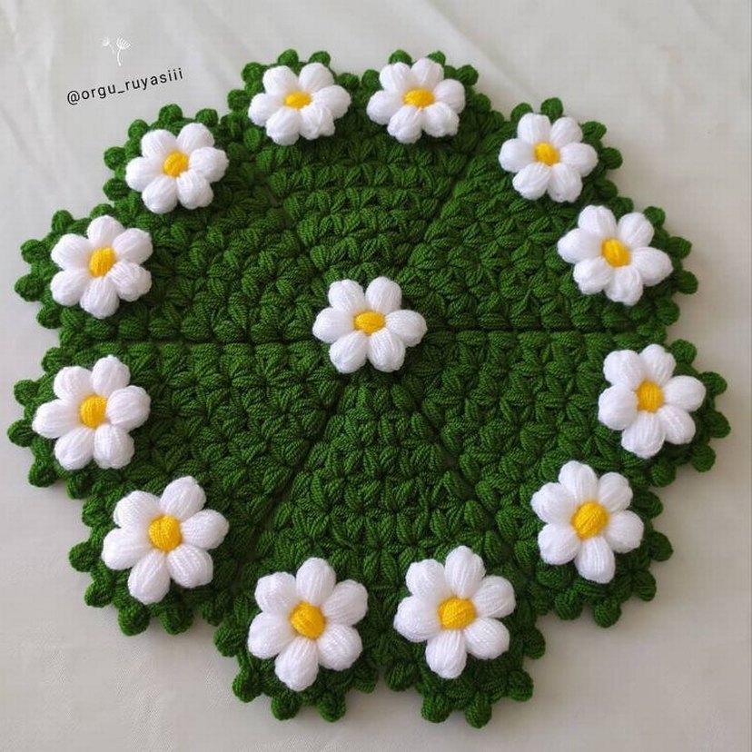 Kenarları beyaz papatya motifleri ile süslenmiş yeşil örgü lif