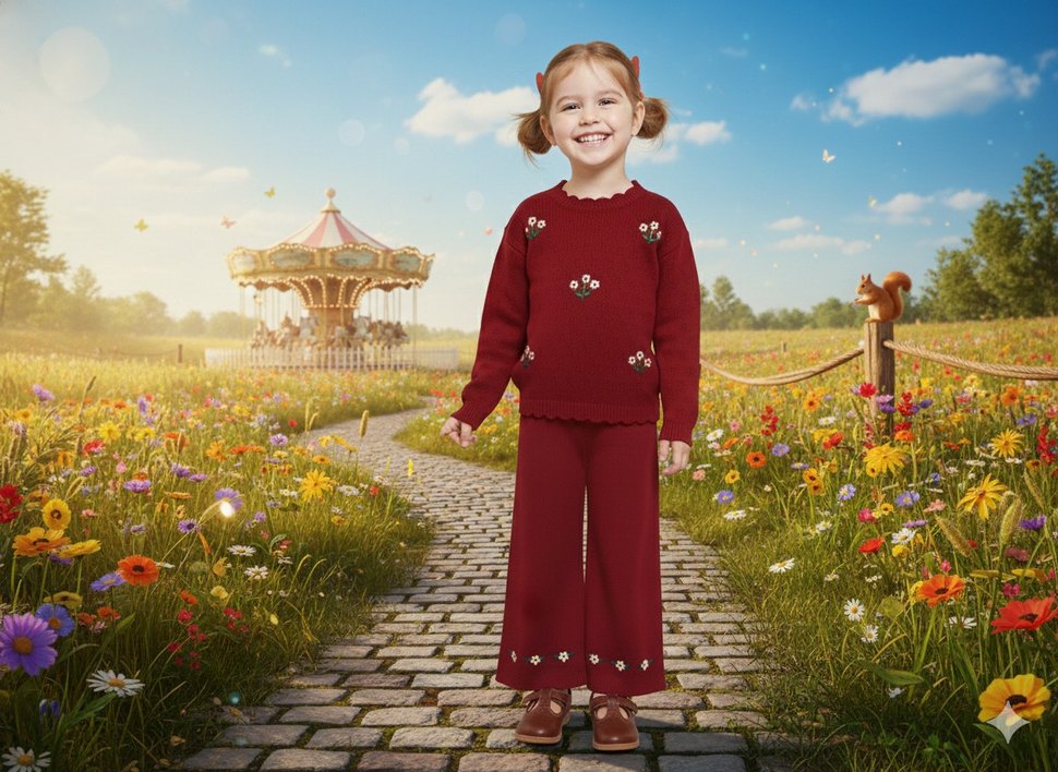 Papatya nakışlı, kazağı delikli, geniş paça pantolonlu alt üst kız çocuk triko takım. Sıfır etiketli kumaşı yüzde 100 akriliktir. Geniş kalıptır