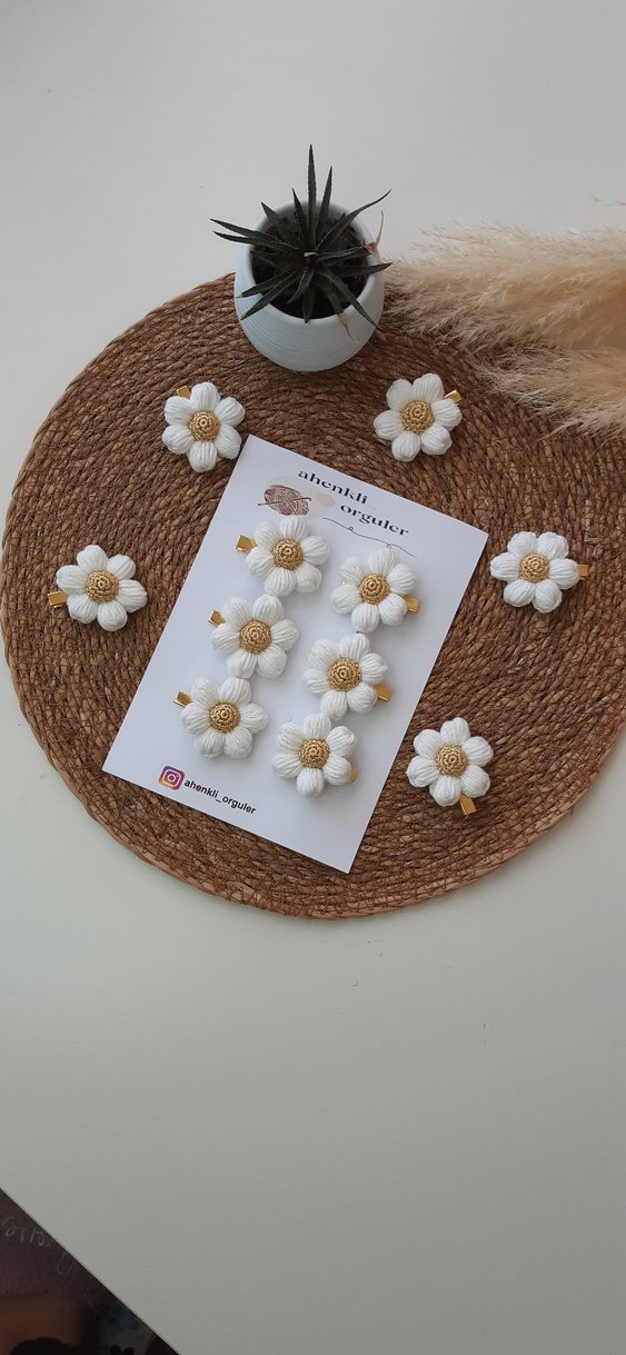 Ortasi simli ipten örülmüş,ekru, çiçek şeklinde çocuk tokalarından oluşan bohem tarzda hafif ve şık set. Bir adet fiyatıdır