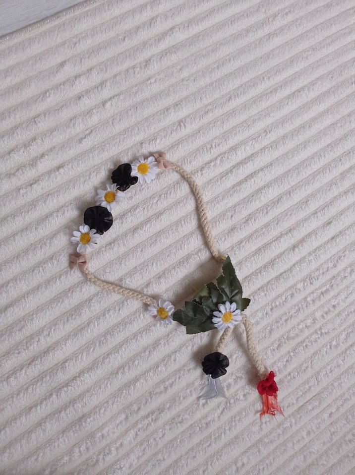 Nakışlı desenlere ve beyaz papatyalar ile yeşil yaprakların bulunduğu boncuklu bohem tarzı saç aksesuarı. Günlük kullanım için normal midi uzunluktadır.