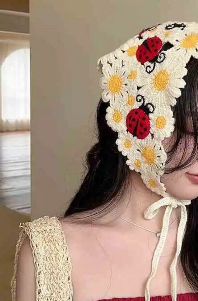 Beyaz örgüden yapılmış, bohem tarzda, papatyalar ve uğur böcekleri süslemeli saç bandı.