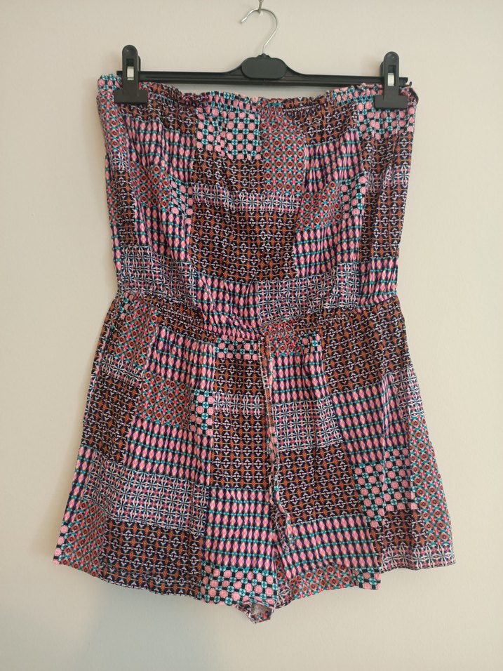 İngiltere'den, kusursuz.Kadın çok renkli, straplez kısa tulum, bol kesim ve kemerli, bohem tarzında, açık hava kullanımı için uygundur.