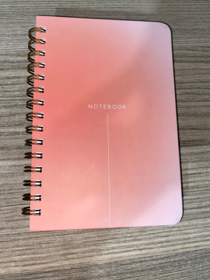 Pastel pembe renkte, spiralli kapak üzerinde "NOTEBOOK" yazılı defter. Not almak ve düzenlemek için uygundur. 10x15 boyutu