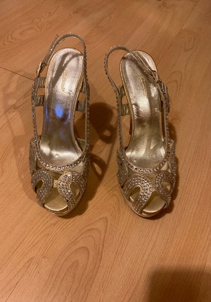 Altın renkli, pullu detaylı ve yılan desenli platform topuklu ayakkabılar. Kauçuk malzemeden, düğün ve şık etkinlikler için uygun. Özel yapım. Sadece üç taşı düşmüş Papucci de özel üretimdir