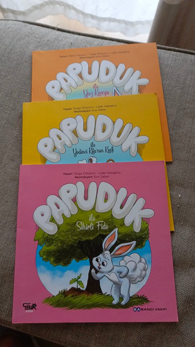 Tolga Öztorun ve Lider Hepçenç'in yazdığı Papuduk karakterli, renkli kapaklı 3 çocuk kitabı seti.