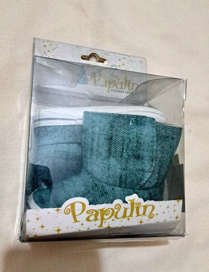 Papulin markalı, turkuaz renkli erkek bebek patik, baskılı desenli ve cırt cırtlıdır. Yumuşak ve sıcak kumaştan üretilmiştir.