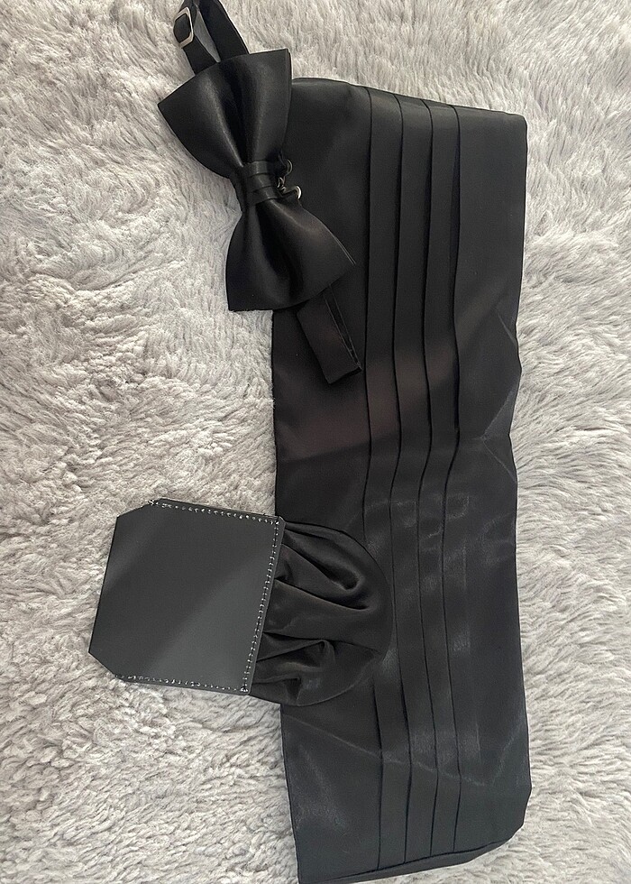 Damatlık papyon kemer mendil takımı siyah saten kumaş sadece papyon bir kez kullanıldı kemer ve mendil kullanılmadı markası Hatemoğlu
