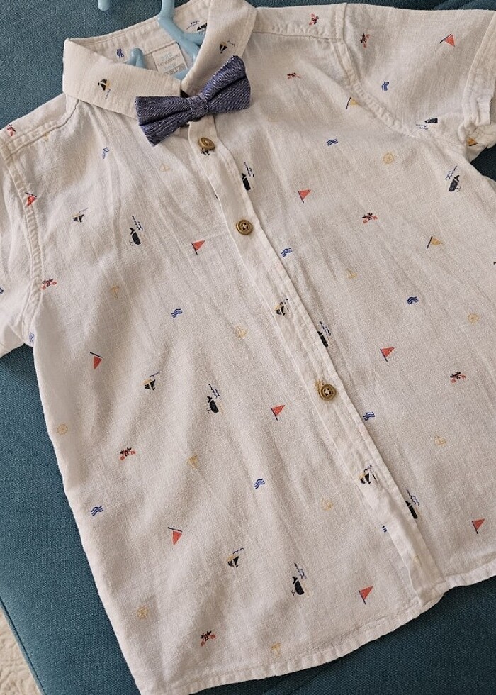 Etiketi 3-4 yaştır, geniş kalıp niz 4-5 yaşta kullandık. Terletmeyen yazlık çok güzel kumaşı var. Papyonu cırtcıtlıdır çıkartılıp takılabilir