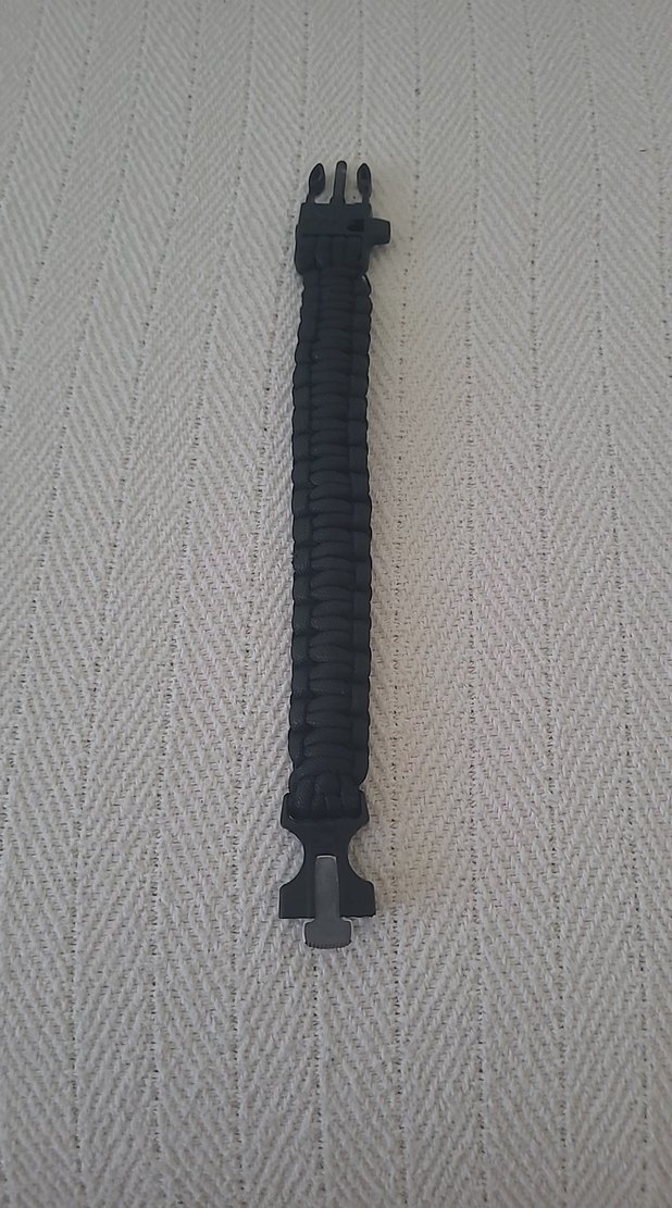 Paraşüt ipiyle(3 metre) örülmüş paracord bileklik.Üzerinde düdük,ateş yakmak için kıvılcım üreten magnezyum çubuk ve Bıçak mevcuttur.Doğayla iç içe vakit geçirmeyi sevenler için hem şık bir aksesuar hem de fonksiyonel bir yardımcı.