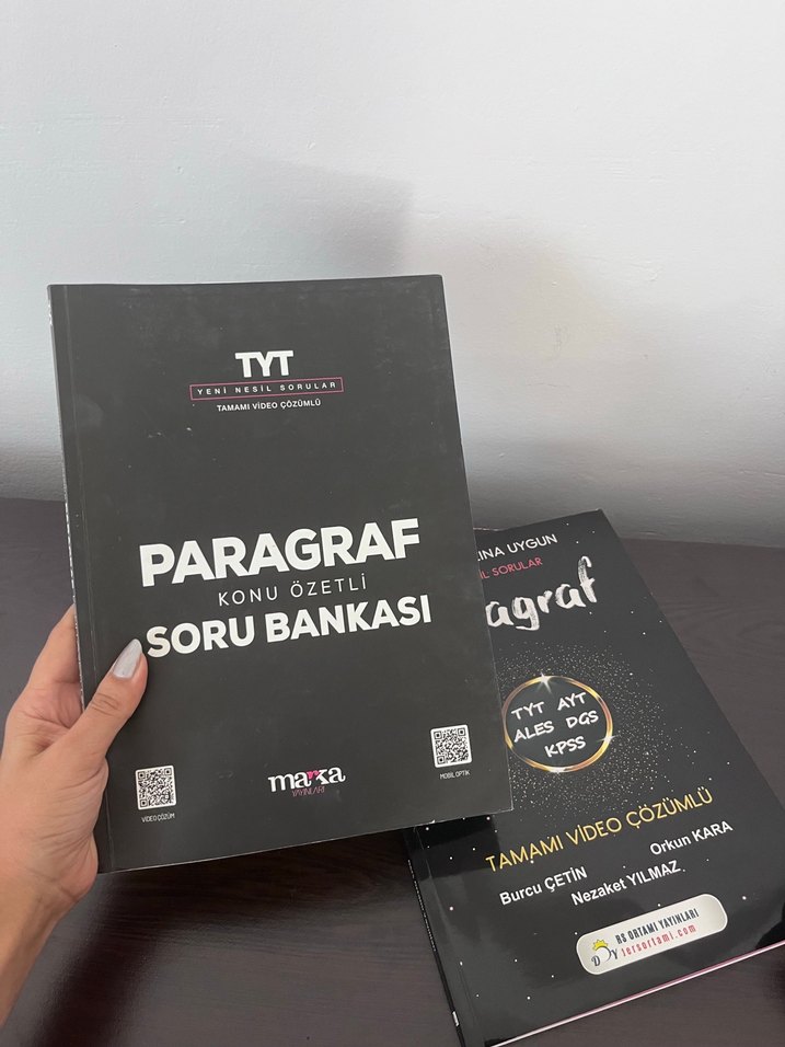 İki adet kitap beraber gönderilecektir TYT için paragraf konu özetli, tam video çözümlü soru bankasıdır. TYT, ALES, KPSS gibi sınavlara uygundur. İlk bir kaç test çözülmüştür dikerseniz silip gönderirim yada kendiniz oradan devam edersiniz