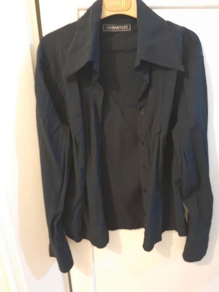 Parantez marka uzun kollu, dar kesim, keten kumaştan lacivert gömlek. Düğmeli ve notalı yaka detayı bulunur. Geniş kesimiyle ofis için uygundur, gotik tarzda. Seden defosuz şık S beden