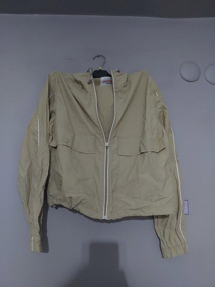 Bej renkli, yüksek yakalı ve uzun kollu kadın ceketi. Fermuarlı, bol kesim ve kısa boyda, pantolonuyla birlikte takımdır. Sokak stili için uygundur. Neredeyse hiç giyilmemiş belki 1 kere giymişimdir, tertemiz ürün.