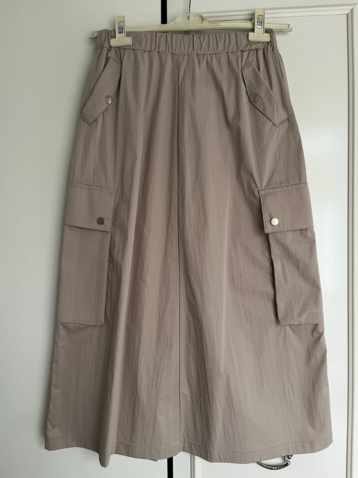 Pudra pembe renkli midi boy paraşüt kumaş etek, rahat kesim iki yanında kargo cepli ve lastikli bel ile günlük rahat kullanıma uygun. Arkasında kapalı yırtmaç detayı vardır. Hiç kullanılmadı.