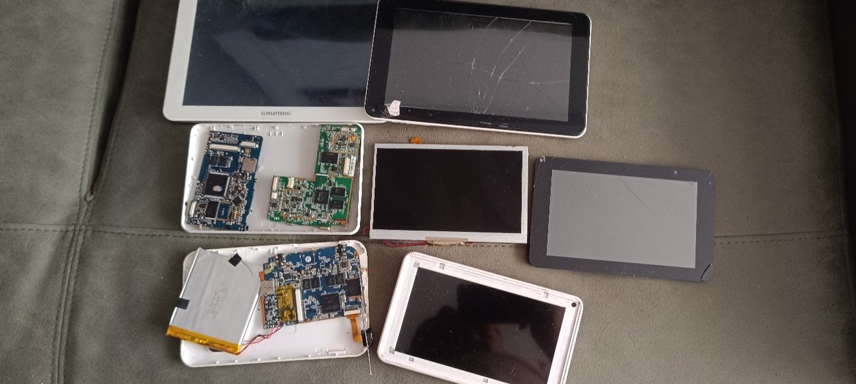 Beyaz tablet parçaları, ekranlar ve devre kartları dahil, bazı ekranlar çatlak veya kasadan ayrılmış durumda.