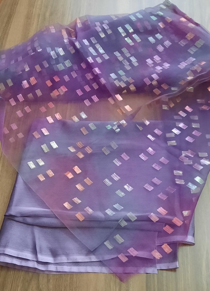Parlak mor renkte, küçük yansıtıcı karelerle süslenmiş, sentetik kumaş elbise, bluz, toka yapımı gibi birçok şeyde kullanılır