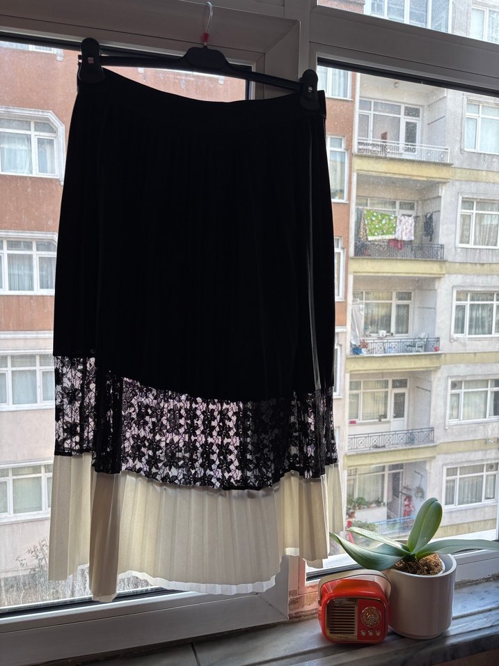 Parçalı Siyah Piliseli Uzun Etek