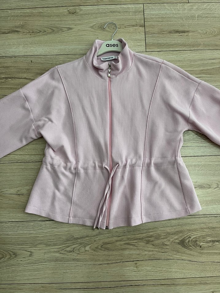 Pembe pastel renkte, fermuarlı önlü, uzun kollu, yuvarlak yakalı, bol kesim, etek takım . Yumuşak ve sıcak dokuda, günlük kullanım için uygundur.