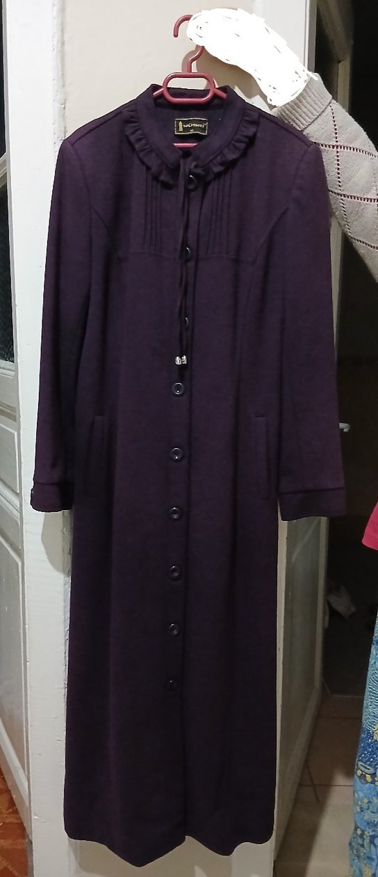 Zühre marka mürdüm renk mevsimlik pardösü/kaban. Tam boydur boyu 130 cm. İki koltuk altı ölçüsü 45 cm. Kalça ölçüsü 50 cm. 40 beden. Yaka kısmında fırfırlar ve kurdele bulunmaktadır. Yanlarda iki cebi vardır. Astarlıdır. Hiçbir deforme yoktur.