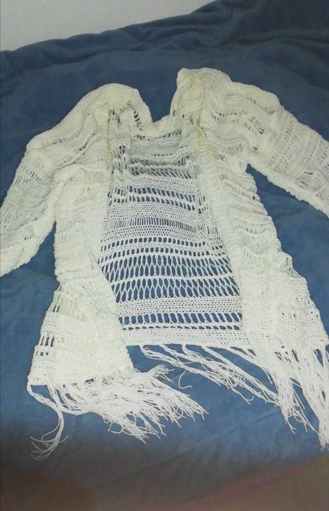 Bohem tarzda, uzun kollu ve kayık yaka, bol kesim beyaz örgü hırka. Püsküllü etek ucu ile günlük kullanıma uygun.