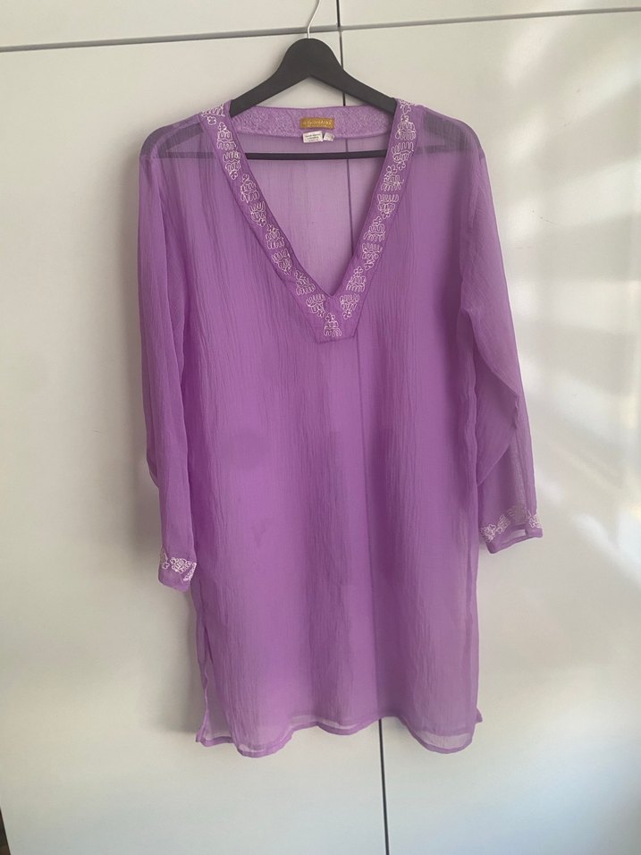 Mor renkte, V yakalı, uzun kollu ve bol kesim bohem midi tunik. İpeksi kumaştan, drapeli detaylı ve pastel batik desenlidir. Günlük kullanıma uygun. En 50 cm boy 90 cm