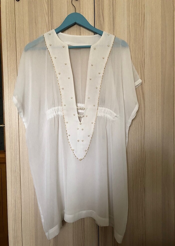 Beyaz pareo M bedene uyumludur. Boyner mağazasından alınmıştır. Beyaz olduğu için bir kez kullanılmıştır. Ürünün ön bel ve arka bel bölümü iki sıra kalın lastiklidir. Ön yaka bölümü boncuk ve incilerle işlenmiş. Açık renk oluşundan görünüş olarak hoş olmayan kocaman ürün etiketi kesilmiştir. Lütfen görselleri inceleyiniz…