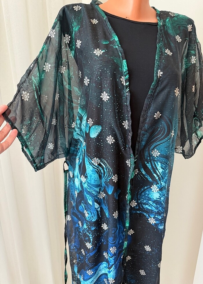 Pareo plajlık kimono kaftan plaj elbisesi siyah mavi çiçek desen