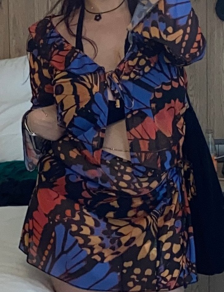 Renkli desenlere sahip, bol kesim pareo takımı. Kolları ispanyol geliyor, 42 beden olmasına ancak kalıbı büyük. İpleryle ayarlanabilir, 46 bedene kadar uyumludur diye düşünüyorum.