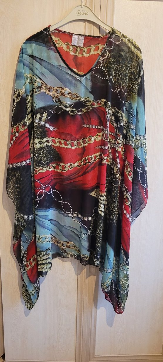 Kadın bikini üstü, gevşek kesim ve uzun boyda, tekne yaka ve ince askılı kollara sahiptir. Sentetik kumaştan yapılmış, zincir detaylı çok renkli desenlere sahip bohem tarzda, günlük kullanım için uygundur.