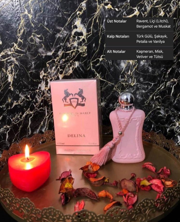 Delina kadın parfümü; üst notalarda bergamot ve misk, kalp notalarında Türk gülü, şakayık, petalya ve vanilya, alt notalarda kaşmeran, misk, vetiver ve tütsü içerir. 6-8 saat kalıcı