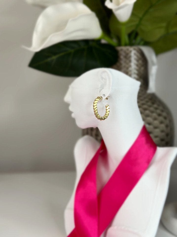 Parıltılı altın renkli midi küpeler, pilili yılan derisi deseniyle klasik zarafeti modern tarzla buluşturuyor, günlük kullanıma uygun.