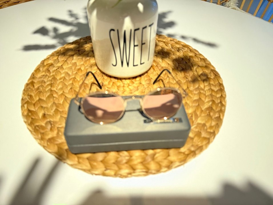 Parıltılı altın renkli, retro tarzda kadın güneş gözlüğü, bohem ve Parisli karşı kültür havasıyla zahmetsiz şıklık sunar.