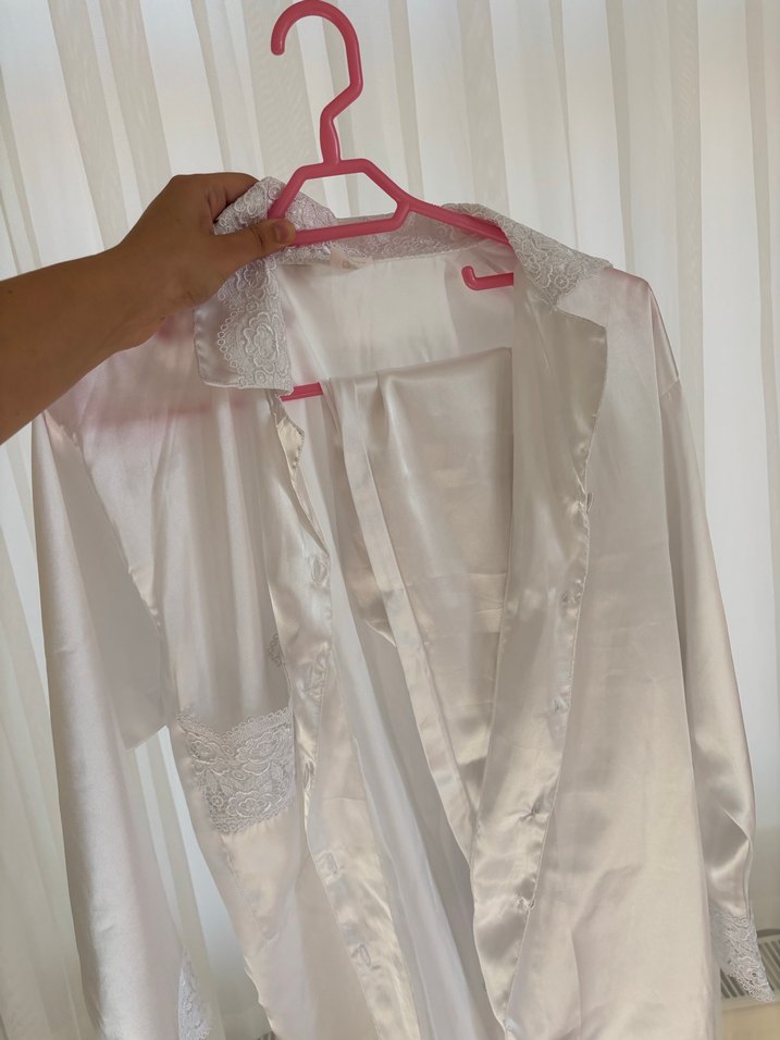 Parıltılı beyaz renk, uzun kollu ve bol kesim midi uzunluğunda kadın sabahlığıdır. Dantel detaylarıyla bohem ve Paris tarzını yansıtır. ✨